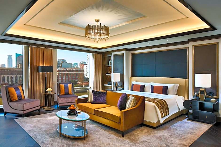 With a size ranging from 70 to 80 square yards, this room features a private terrace with panoramic views of the Suzhou river and Lujiazui skyline. The bedroom features a king-size bed with lavish linens and custom-design furniture. The spacious bathroom includes a white granite bathtub and a separate shower.